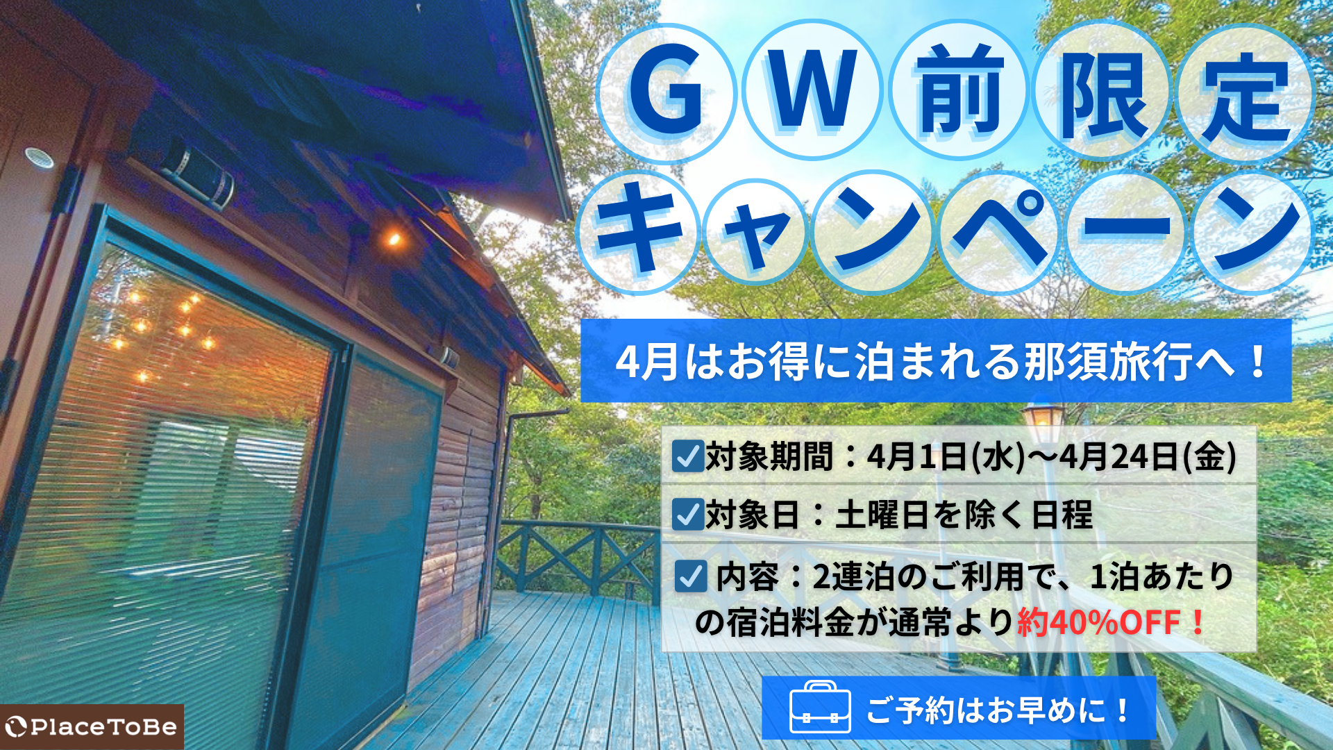 そんな4月にあわせて、【PlaceToBe NasuMachi】では「GW前限定キャンペーン」を開催いたします。