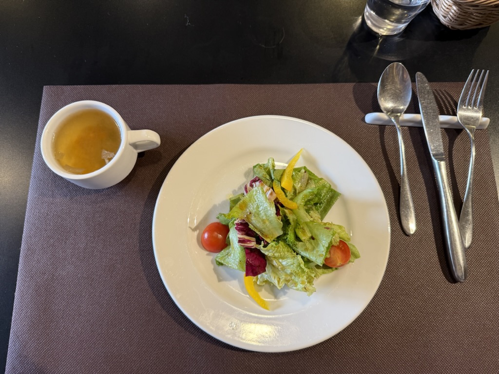 スープは野菜の旨みがしっかり感じられるやさしい味わいで、サラダは彩りも美しく、ドレッシングがとても美味しかったです。